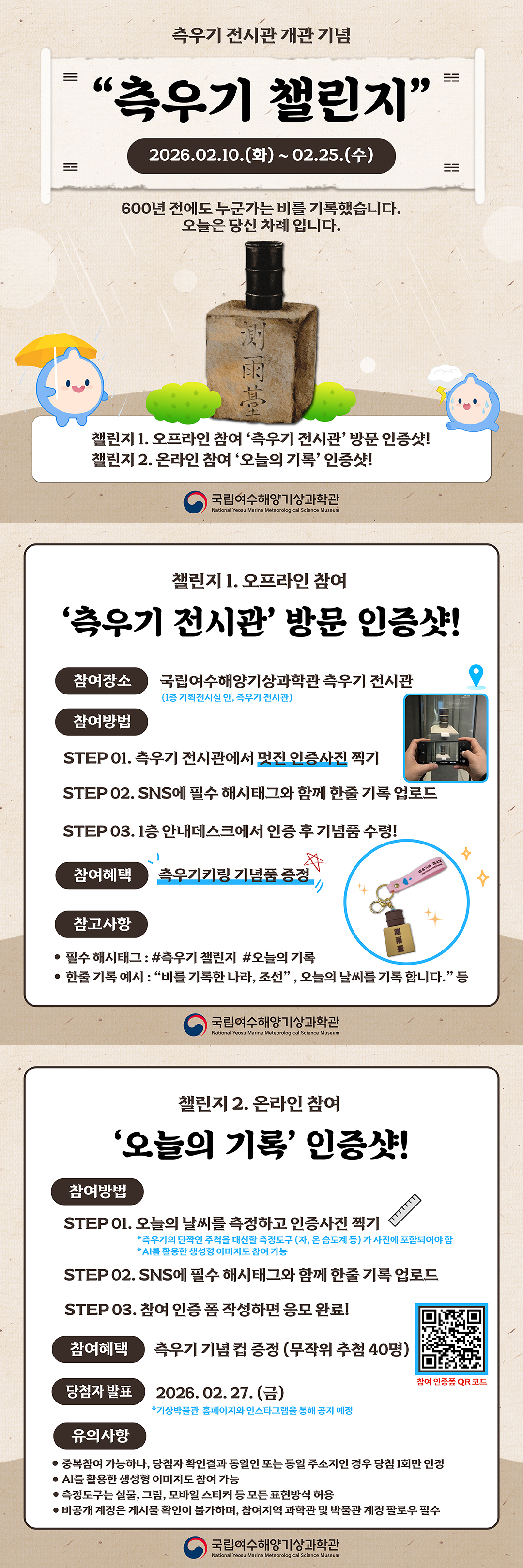 측우기 전시관 개관을 기념하여 '측우기 챌린지' 이벤트를 개최합니다. 관심 있으신 분들의 많은 참여 바랍니다.