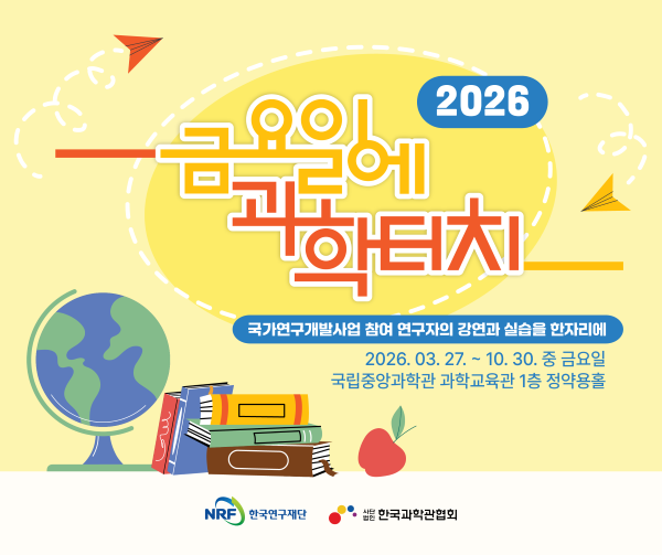 2026 금요일에 과학터치 대전지역 공개강연 안내 한국연구재단과 한국과학관협회는 국가연구개발사업을 통해 창출된 연구 성과와 과학 지식을 일반 국민을 대상으로 쉽고 재미있게 전달하여 과학기술에 대한 이해도 제고와 과학적 마인드 향상을 목적으로 '금요일에 과학터치' 강연을 개최하고자 합니다. 과학에 관심 있는 청소년들의 많은 신청 바랍니다.□ 3월 강연 안내 □ 강연 개요 ㅇ 강연 일시 : 2026. 03. 27. ~ 10. 30. 중 금요일(연중 총 18회 실시) - 도입강연 : 18:30 ~ 19:00 - 본 강 연 : 19:00 ~ 20:30 ㅇ 강연장소 : 국립중앙과학관 과학교육관 1층 정약용홀(대전광역시 유성구 대덕대로 481) ㅇ 강연대상 : 과학에 관심이 많은 초·중·고등학생 및 성인 누구나 ㅇ 강연내용 - 도입강연 : 과학원리 실험·실습 기반 현장 강연 - 본 강 연 : 국가연구개발 참여 연구자 현장 강연□ 신청 개요 ㅇ 신청방법 - 사전신청: '금요일에 과학터치 홈페이지'에서 신청* (https://sciencetouch.nrf.re.kr/) * 참여광장 → 강연참석 및 확인증 → 강연참석 신청 → 대전지역 선택 후 원하는 강연 신청(선착순 50인 실습재료 및 간식 증정) - 현장신청: 강연일 당일 강연장소(국립중앙과학관 과학교육관 정약용홀) 방문 후 현장 접수(강연 시작 1시간 전부터 접수대 운영) ㅇ 참가비용 : 무 료(과학관 내 주차요금 별도) ㅇ 문 의 처 : ☎ 042-862-7919 (한국과학관협회 전략사업팀)□ 강연 참석 이벤트 ㅇ 강연 신청 후 참석자에게 추첨을 통해 도서문화상품권 3만원 상당 증정 (매 회 5명) * 강연 신청 후 강연일에 실제 참석한 자에 한함 (본강연 종료 후 현장인원 중 추첨) ** 해당 강연일로부터 7일 이내 당첨자에 한해 SMS 발송 *** 경품 이미지는 실제와 상이할 수 있으며, 실제 경품은 운영기관에 사정에 의해 변경될 수 있음 ㅇ 강연 신청 후 참석자 전원에게 금요일에 과학터치 강연노트 증정 (1인 1권 증정, 선착순 600권 소진 시 종료)