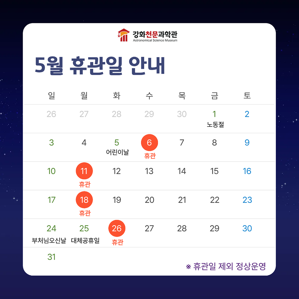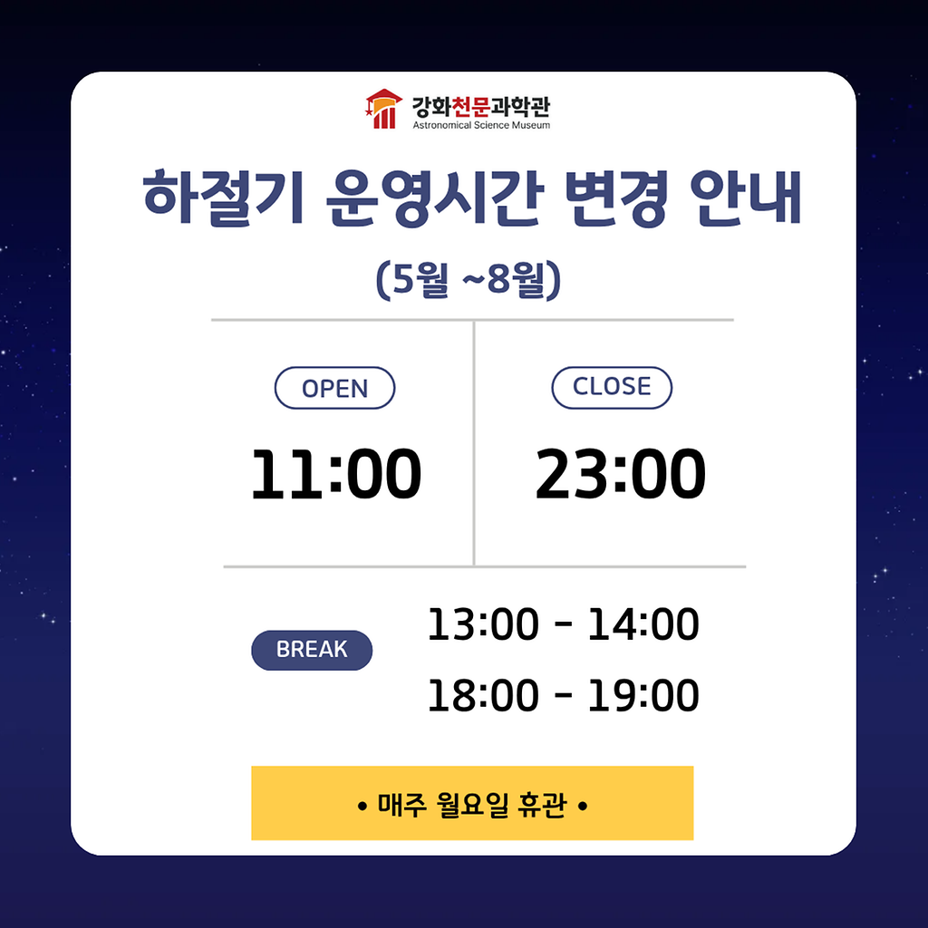 5월 휴관일 및 하절기 운영시간 변경 안내(강화천문과학관)
